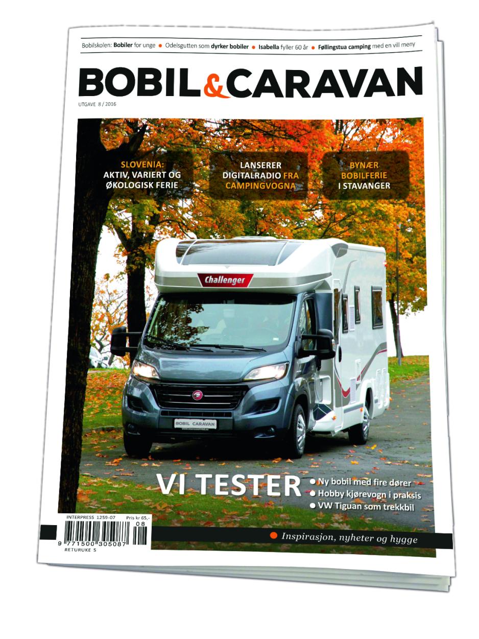 Dette er noe av innholdet: Har du lyst på lokal norsk inspirasjon kan du bli med på vår bynære bobiltur til Stavanger. Les mer om hvilke oppstillingsplasser som finnes, hva kan du finne på her? Julemarked er et aktuelt stikkord i disse dager. Eller hva med å planlegge sommerens ferietur, hvor det er all grunn til å stoppe i Slovenia. Les om Bled og dets nærområde, som har både fjell, fosser og krystallklare innsjøer. I denne utgave 8-16 er Hobby 540 KMFe De Luxe reisevogn testet med splitter nye VW Tiguan som trekkbil. Bli også med og opplev hvordan entusiastiske hundekjørere organisererer sine reiseboliger, det er inge tvil om at det er hundene som er i fokus her. Har du hørt om odelsgutten som dyrket bobiler? Møt ham i denne utgave 8-2016. I tillegg markeres Isabellas 60-års jubileum, og mye mye mer på 100 sider med inspirasjon, nyheter og hygge... I 2016 har forlaget også utgitt en dedikert tittel for reiseglede på hjul: 100% Reise med Bobil & Caravan. En liten smak på innholdet kan du få her: https://issuu.com/bobilogcaravan/docs/100_reise