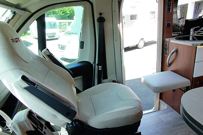 Et merkelig sted å sitte, tenker du kanskje når du ser det lille setet som er montert på kjøkkenbenken på P-serien, samt G600 og G650. Forklaringen er enkel, det er selvsagt mulig å sitte her, men først og fremst brukes setet som fotskammel, kan Pilote fortelle. Sitter du i en bakovervendt passasjerstol, er det lille setet perfekt plassert for en avslappet kveld i ”godstolen” med beina passe høyt plassert!