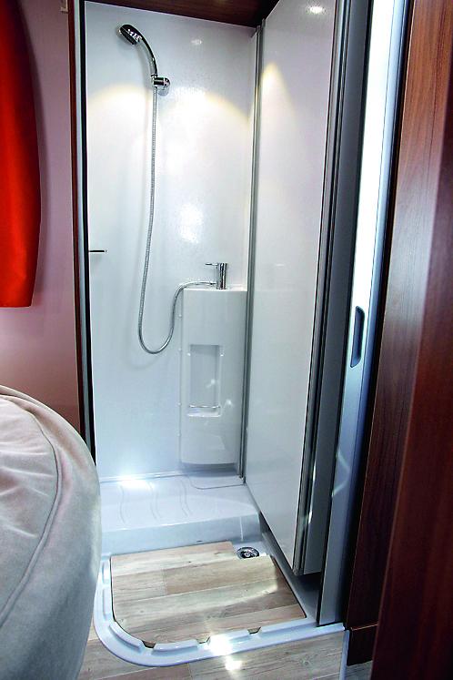 Nytt av året er at modellene Pacific P650 og P656, samt Galaxy G600G og G650C/GJ får et nyutviklet bad. Det er en løsning som flere produsenter har gjort tidligere, mer eller mindre vellykket. Pilote har løst oppgaven med å lage en ganske tradisjonell løsning med toalett og vask, samt et greit utvalg hyller og skap som standard. Men så skjer det ”magiske”: Ved å løsne veggen og vri den 90 grader, så kommer dusjen til syne. Løsningen fungerer tilsynelatende greit i teorien, og det er ingen tvil om at den er plassbesparende.