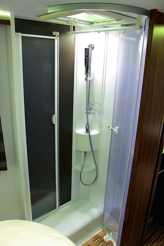 Toalettrommet og dusjen befinner seg på hver side av midtgangen mot soveværelset bak. Som vanlig er det ikke flust med plass i toalettrommet, men vi har sett det verre. Rommet måler 90 x 78 x h 188 cm og toalettet fungerer greit, og ved å plassere føttene riktig, kan man vaske seg i ansiktet med døren igjen. Da må vi også nevne at den slags er beregnet å gjøre med døren åpen, det er skyvedør som stenger av framover i bilen. I dusjen går det også greit for seg. Den måler 70 x 75 x h 192 cm, og står du diagonalt kan du vaske håret uten å støte albuene i veggen. Den er bra fuget og glassdørene tetter tilsynelatende bra. I toalettrommet er det et luftevindu, i dusjen en takluke. Over toalettet er det et veggskap, under vasken et benkeskap med til sammen tilstrekkelig plass for oppbevaring. Det er et speil og bra belysning. Toalettet er et Thetford C260.
