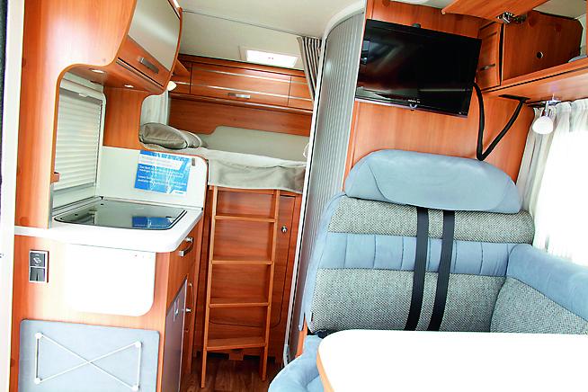 Det er selvsagt viktig å utnytte plassen, og det har Hymer gjort. Vanntanken er plassert i bakkant av bilen, delvis synlig inne i garasjen. Plassen under sittegruppen er brukt til en stor skuff med masse lagringsplass. Truma-varmeren og gasstankene er begge plassert under sengen, med adgang fra garasjen. Litt upraktisk og vanskelig adgang å skifte gassflaske en kald vinternatt om du først må tømme halve garasjen for å komme til. Garasjen har to dører og kan leveres med en smart ekstraluke bak på bilen.