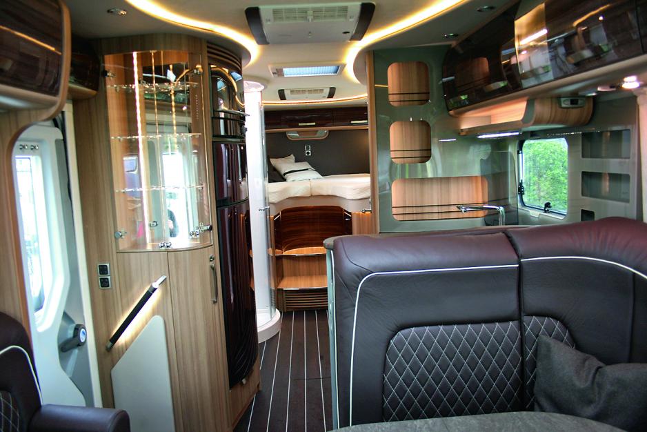 Men det er likevel når du går inn du virkelig blir imponert. En stor og luksuriøs sittegruppe med skinnseter, stort bord og den store 32” TV-en som stiger opp av skapet bak den ene seteryggen. Kjøkkenet er utstyrt med induksjonsplate og to kokebluss. Benkeplate og vegger er i gråtoner. Med sine mange ”hyller” med indirekte lys og høyglanslakkerte skapdører er det en fryd å ta oppvasken. Stort kjøleskap med fryser, og selvfølgelig stekeovn på toppen. Badet er likevel det vi blir mest imponert over. Lukker du dørene til oppholdsrommet og soverommet har du et meget romslig baderom. Toalettet er et lite steg opp, dusjen er romslig og vasken har en moderne utforming - store speil med godt lys. Sengene lengst bak har to trinn opp og godt med oppbevaringsplass. Er du ute etter en bobil som har det lille ekstra, men ikke ønsker å kjøre en bobil i liner-klassen, bør du ta en titt på Knaus sitt nye flaggskip. Bobil & Caravan fikk dessverre ikke prøvekjørt bobilen ved denne anledningen, men kommer tilbake med mer info om kjørekomfort og brukervennlighet.