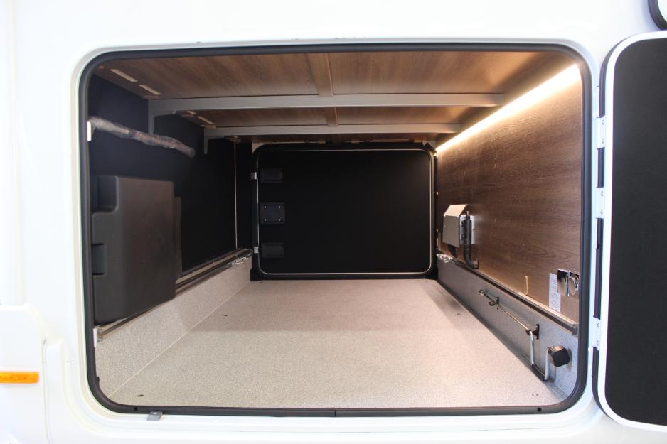 Garasjen på testmodellen har ikke nok høyde for sykler, men er ellers romslig for den øvrige bagasjen vi oppbevarer her. Den måler 213 x 112/122 x h 83 cm. Det er luker på hver side og åpningene måler 104 x 75 cm. Garasjen har ikke adkomst innenfra. Klesskapene som henger over sengene bak måler 60 x 33 x h 80 cm og 52 x 58 x h 81 cm. Sammen med skapene under sengene og overskapene på tre vegger, er det flust med oppbevaringsplass for klær og annet på soveværelset. Badet har som nevnt tilstrekkelig med plass, mens kjøkkenet er overraskende romslig med nok av skapplass. Sammen med overskapene framme i bilen og et og annet skap eller rom andre steder er det god plass til feriebagasjen og enda mer.