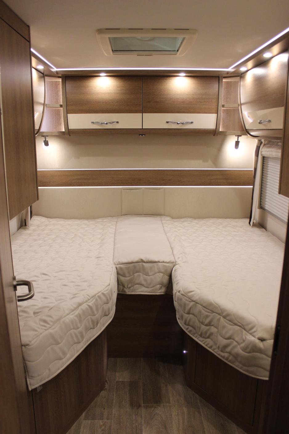 En bobil på 7,5 meter med en klassisk planløsning, som vanlig bygget på Fiat Ducato og integrert. Det er vårt utgangspunkt for denne utgavens bobiltest. Som normalt er testen gjort i Norge på en norsk-tilpasset utgave av modellen. Bak finner vi to enkeltsenger, lave. Ønsker du garasje for sykler finnes det, men sengene blir høyere. Det er da fortsatt 90 cm høyde over sengene. Foretrekker du frittstående dobbeltseng bak finnes det også, men ellers lik bil.
