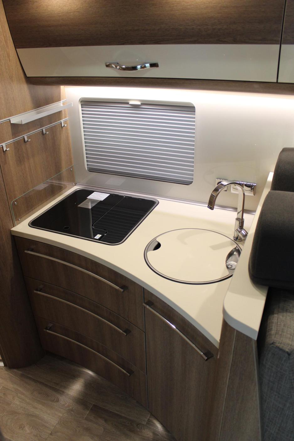 På motsatt side står Tek Tower fra Dometic. Det er kjøleskapet RMDT 8555 på brutto 190 liter der 35 liter utgjør fryseskapet. På toppen står stekeovnen. Vi syntes kjøkkenet var velutstyrt med mye plass, spesielt oppbevaringsplass. Vifte, lufting, lys pluss fin design gir et kjøkken over gjennomsnittet.