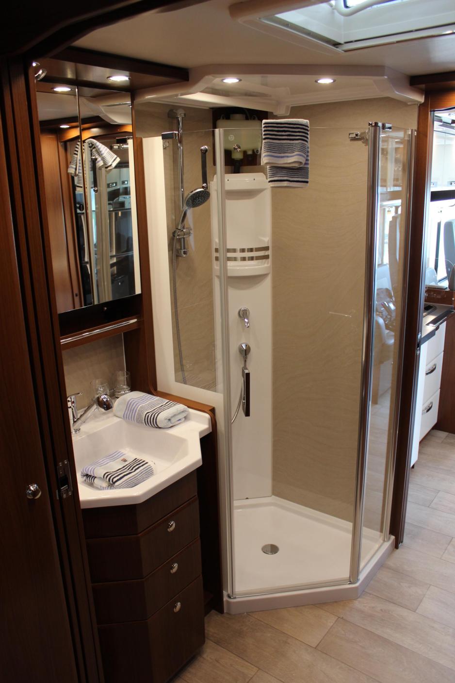 Badet utgjør halvannen meter av bilens lengde, der vask og dusj står på den ene siden, toalettet i et eget rom og klesskap på motsatt side. Forover og bakover i bilen kan det lukkes av med doble skyvedører. Mellom rommet og sengene bak er det et klesskap på hver side. Her kunne kanskje døren vært plassert bakenfor disse skapene. Da hadde rommet blitt over to meter langt og klærne i rommet vært lettere tilgjengelig. Eget rom for toalettet kan kanskje virke unødvendig, men på dagtid kan det benyttes uten å stenge av de store skyvedørene. Rommet er uansett stort nok for toalettbruk, og for øvrig er badet meget bra ved bruk av vask og dusj. Toalettet er et keramisk vakuumtoalett med stor fast tank. Den flotte vasken har tre skuffer på undersiden og et tredelt glasskap på veggen over. På hver side av skuffene er det plass til å henge håndklær. På toalettet er det tørkestativ for håndklær tilkoplet Aldevarmen, og et lite veggskap.