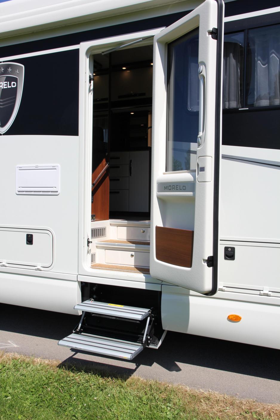I førerhuset har frontruten varmetråder. En elektrisk gardin fungerer som både solskjerm og gardin om natten. Under kjøring kan den ikke gå lenger ned enn til solskjermnivå. Sidevinduene betjenes elektrisk, og de har dobbelt glass. Verdt å legge merke til er at hele dashbordet er produsert av Morelo. Det er isolert hele veien, og hindrer kulderas - som man vil oppleve med standard-dashbord. Rattet kan enkelt tas av, noe som ellers ville ha hindret førersetet fra å kunne snus rundt. Gulvet er sammenhengende fra førerhuset og bak til soveværelset. Det er ikke innvendige luker i gulvet til kjelleren, men mange luker utvendig. Døråpningen er 67 cm bred, døren er solid og har vindu. En elektrisk trapp med to trinn fører opp til dørterskelen, og to trinn til fører inn på gulvet. Høydene er 28-23-27-21-20 cm, som er akseptable mål.