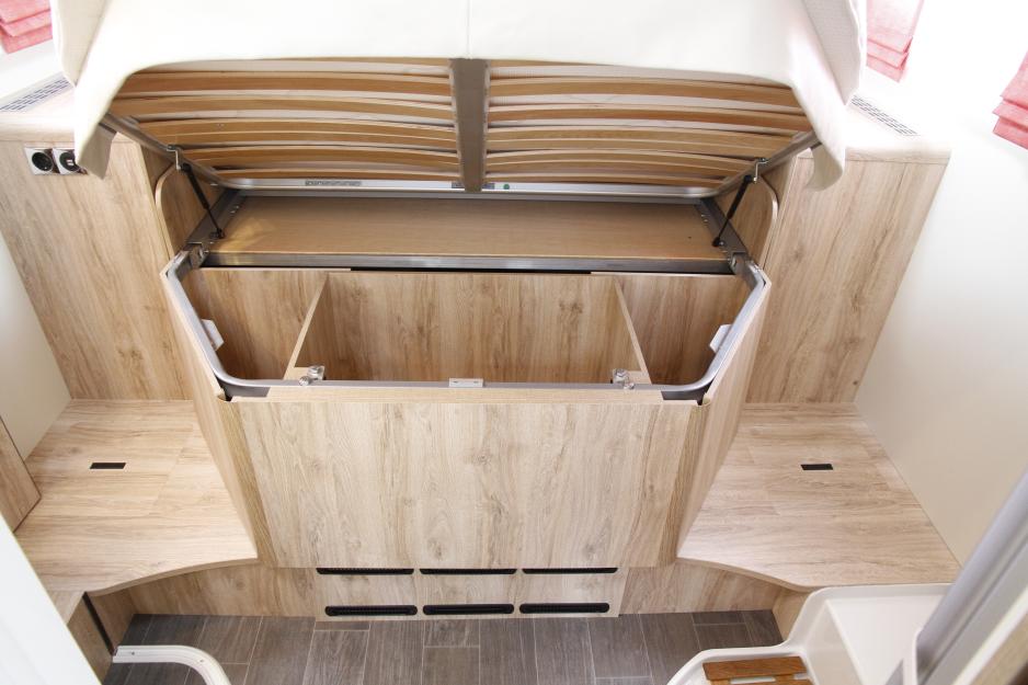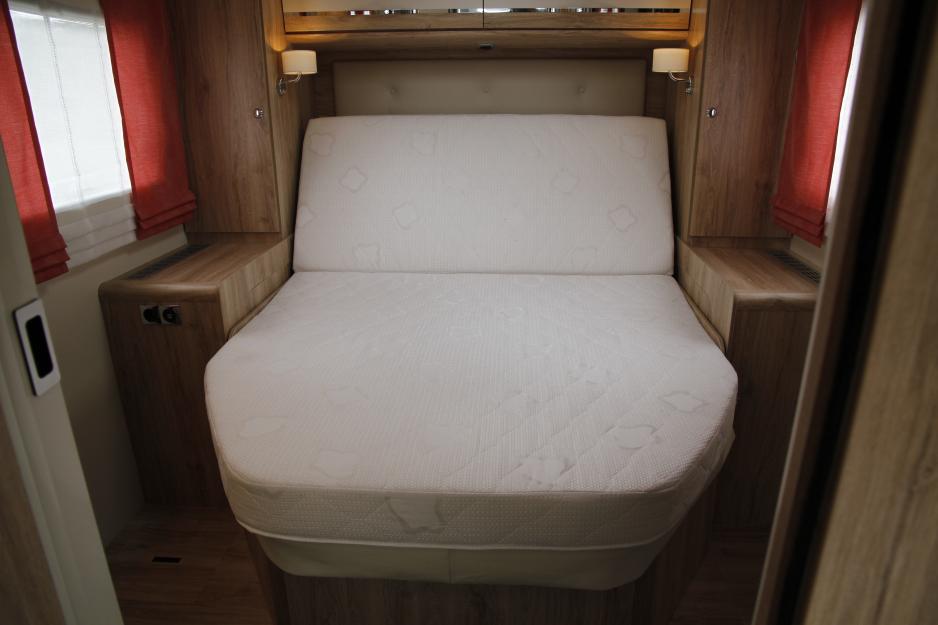 Lyset ved sittegruppen er plassert direkte på overskapet, slik at du ikke lenger skaller i det. Det er vesentlig bedre plass i kjøkkenbenken, da gasskassen ikke lenger er plassert her. Dobbeltsengen har elektrisk drevet hydraulisk heve- og senkefunksjon. Så du kan prioritere å ha med sykler i garasjen (opp til 125 cm), eller en lavere seng (20 cm).