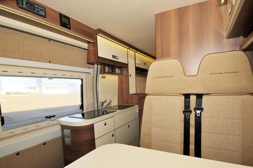 Globe-Traveller Voyager har et påbygg på taket, som produsenten kaller “mini-alkove”. Det gir en høyde på 2,95 meter. Løsningen gir fire soveplasser på alle de fire modellene når “klapp-sengen” oppunder taket foran tas i bruk. Den faste sengen bak er enten en fransk løsning med forholdsvis smal dobbeltseng på 123 cm og bad ved siden av, eller to enkeltsenger med greie mål. Bybobilen leveres enten i 5,99 eller 6,36 meters lengder.