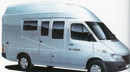 Det mest oppsiktsvekkende med bilen er altså at den ved første øyekast ser ut som en original Sprinter med forhøyet tak. Men så viser det seg at bilen har et avansert påbygg med muligheter for elegante løsninger. Her må og nevnes markisen som er integrert i taket. En helstøpt glassfiberkasse er solidere (sikkerhet ved kollisjoner) og eliminerer risikoen for lekkasje. Er dette fremtiden? Jeg tror ikke det. Men det vil absolutt være et alternativ til de tradisjonelle påbyggene. Selv om planløsningen innvendig er nokså tradisjonell har bilen mange spennende detaljer. Vil du se en må du foreløpig til Tyskland. Hva med Caravan Saloon i Düsseldorf 31.8 til 8.9.02. Eller du kan klikke deg inn på Internett med adressen www.la-strada.de.