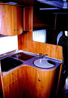 Kjøkkenbenken (98 x 53/ 104 x h 92 cm) er en kompakt benk i vinkel. Arbeidsflaten på benken er noe beskjeden og da gasskassen er plassert i benken er skapplassen kraftig redusert. Dog er det to skap og en skuff. Overskapet er som tidligere nevnt smekkert utført men mer plass savnes. Av utstyr finnes tre kokebluss (Cramer), integrert med glasslokk, oppvaskkum og avdryppningsbrett. Belysning sørger to spotlights for, avtrekksvifte finnes ikke, men den store takluken (Heki 3) befinner seg rett over. Dessuten er det som vanlig et vindu som kan åpnes. Kjøleskapet (RM 7505, 135 ltr. Med separat fryseskap og AES) befinner seg på motsatt side. Kjøleskapet er hevet litt opp, noe som gir et lite skap under og et over.