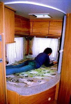 Dobbeltsengen (190 x 130/ 85) i denne løsningen er som vanlig ikke for storvokste. Men når det er sagt er madrassen 13 cm tykk og ligger på fjærende trespiler. Videre er det muligheter for varme under sengen og det er lagt varmluft langs veggen. Over sengen er det ved fotenden et TV-skap, videre fire overskap, to av dem med hyller. Det er takluke, to vinduer og to spotlights gir leselys. Under sengen er bagasjerommet og den kombinerte vannvarmeren og varmeovnen Truma C3402. Klesskapet (53 x 45 x h 128 cm) er bygget over den ene hjulkassen og har et skap på oversiden. Sittegruppe: Putene i sittegruppen er behørig omtalt tidligere. Vi har altså en toseter i kjøreretningen med to trepunkts sikkerhetsbelter. Denne inneholder dessuten vanntanken på 100 liter. Ved å forlenge bordet, nås dette fra toseteren på langs, dessuten fra passasjersetet om dette snus. Toseteren inneholder en skuff som kan trekkes ut foran inngangsdøren, sikkert tiltenkt skotøy. Resten av benken er noe vanskelig tilgjengelig og huser blant annet bodelsbatteriet.
