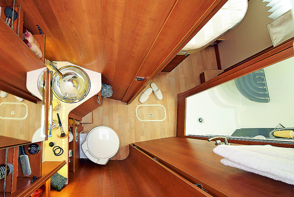 Toalettrommet har tre hovedingredienser, do, dusj og vask. Men stadig oftere ser vi at dusjen er plassert utenfor rommet, i forbindelse med soveværelset bak i bobilen. Å benytte dette utstyret har ikke vært like enkelt for alle. Vasken har ingen betenkeligheter med å benytte. Toalettet trenger litt tilvenning, så fungerer det greit. Men å dusje i bilen faller vanskelig for noen. Igjen er det en vanesak. Dette kan delvis skyldes at dusjen er upraktisk innredet. Men fungerer alt, kan reisen foregå helt uavhengig av campingplasser og andre steder med offentlige sanitæranlegg.