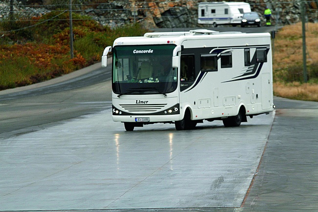 – Hvilke forventninger hadde du til glattkjøring med bobil? – Jeg var litt spent, men tenkte mest på å unngå en bråstopp. Bobilen var som vanlig fullpakket for tur. Det betyr at det er mange ting som for eksempel servise og glass som ligger delvis løst inne i skap. I tillegg hadde jeg som vanlig med scooter, båt og påhengsmotor. Jeg tenkte at bilen var såpass tung at den ikke ville skli særlig, men det gjorde den… – Den første øvelsen var å bli kjent med underlaget og gjøre en nedbremsing på rett vei, hvordan gikk det? – Bobilen oppførte seg overraskende bra. Jeg var meget godt fornøyd med ABS-systemet, og dette var første gang jeg fikk testet de skikkelig. Jeg opplevde å ha grei kontroll underveis, men det skyldtes at jeg la noen begrensninger på meg selv. Jeg hadde tross alt ikke lyst til at bilen skulle snurre rundt. Jeg tipper den fullastede bobilen bygget på Iveco-chassis veide drøyt 7,2 tonn slik den var rigget utpåpå banen. Men det var ingen ubehagelige overraskelser.
