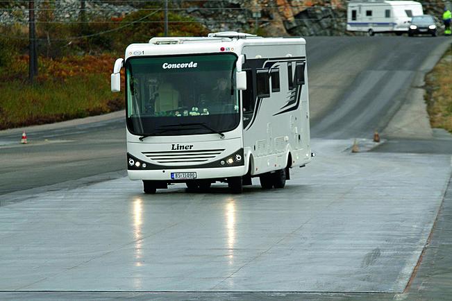 Han kjører en ni meter lang bobil som veier over sju tonn. Bjørn Arild Rake fra Tjøme utenfor Tønsberg har aldri nødbremset sin Concorde. På glattkjøringsbanen fikk han ikke bare testet ut nødbrems, det ble også sladding!