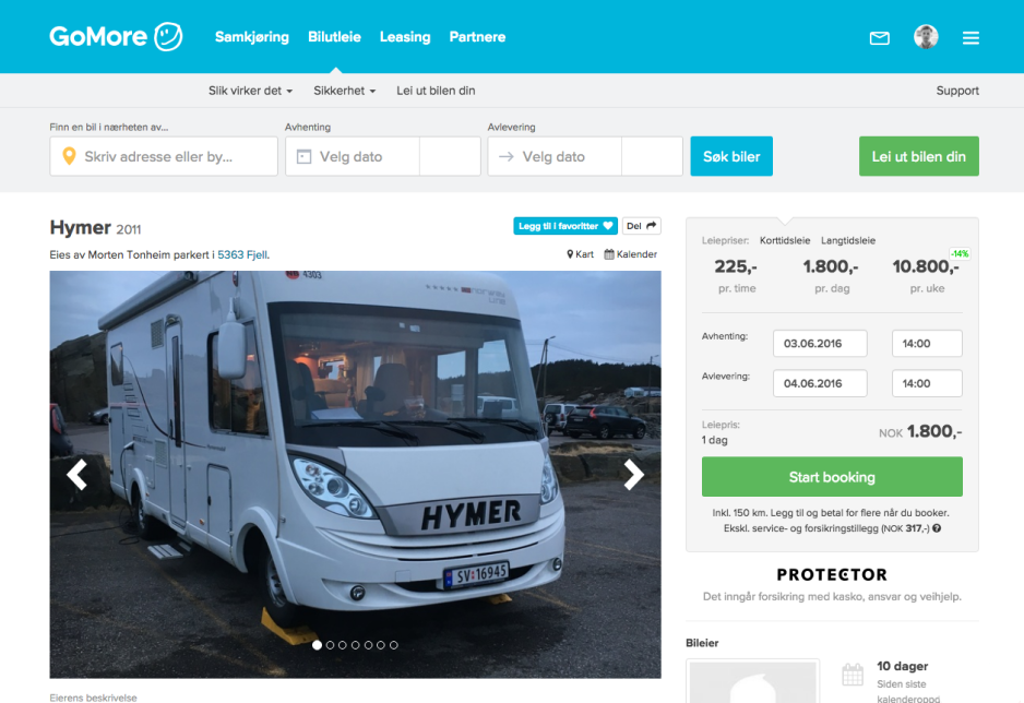 Det betyr at du som bobileier kan leie ut til reiselystne nordmenn når du selv ikke bruker bobilen. GoMore tilbyr en spesialforsikring til bobiler med veihjelp, som er inkludert i alle leieavtaler som gjøres på plattformen. Du som skal leie ut oppretter en bilannonse, legger til bilder og beskrivelse og setter ønsket pris. Interesserte leietakere vil kunne filtrere etter biltype og plassering, og kan i løpet av noen minutter legge inn booking og sette av betaling til utleier. Mer informasjon her: https://gomore.no/rental/campervan/owner