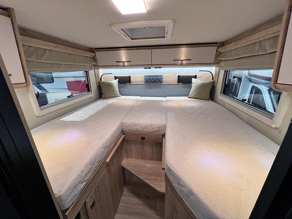 Bilen er under sju meter og har en bredde på 220 cm. Enkeltsengene er 195 cm lange. Badet har en smartløsning, som lar deg velge mellom dusj eller toalett og vask.
