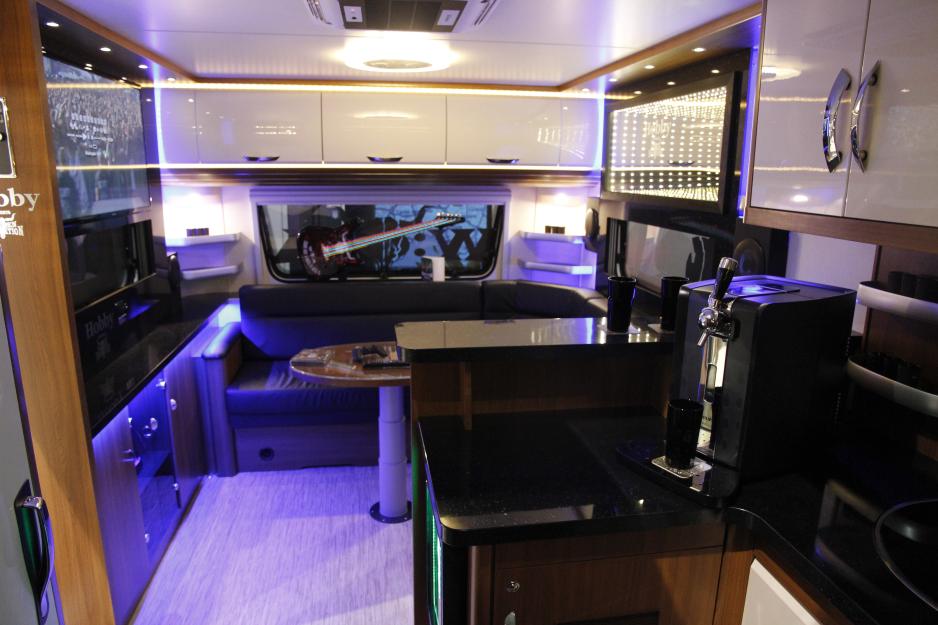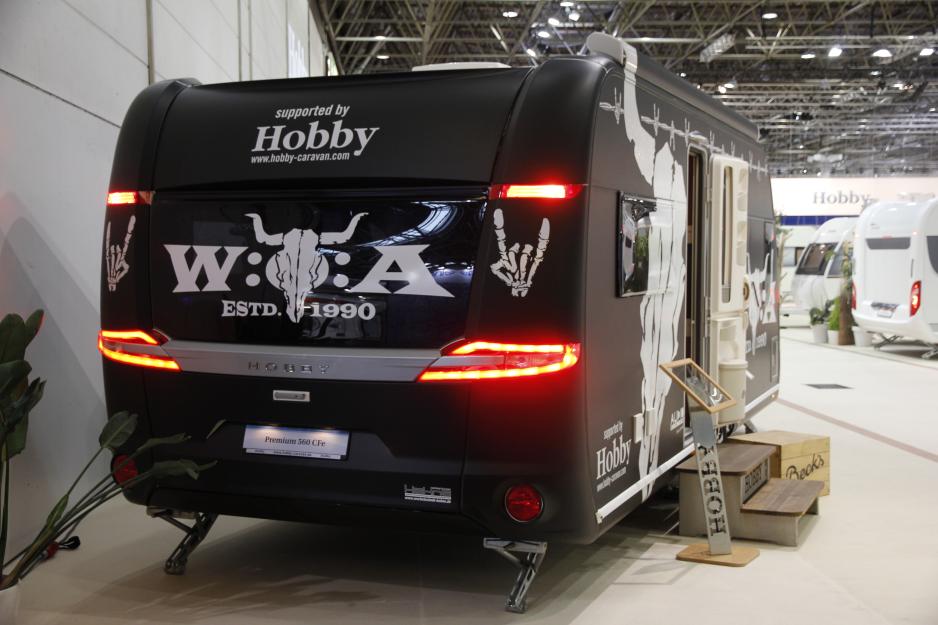 Hobby har benyttet anledningen til å få litt ekstra fokus på verdens største messe ved å dekorere en Premium 560CFe i tema metall rock: Vognen er i mattsvart med hvit dekor og innvendig er det en svært gjennomført finish på interiøret. Her er det alt fra TV med hjemmekinoanlegg og Playstation til kaffebar og sengetøy med samme grafiske elementer som på eksteriøret. En veldig tøff campingvogn, som viser hvor mye egenart det er mulig å få til.