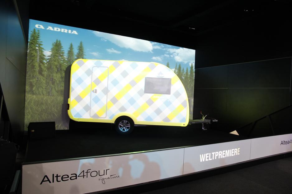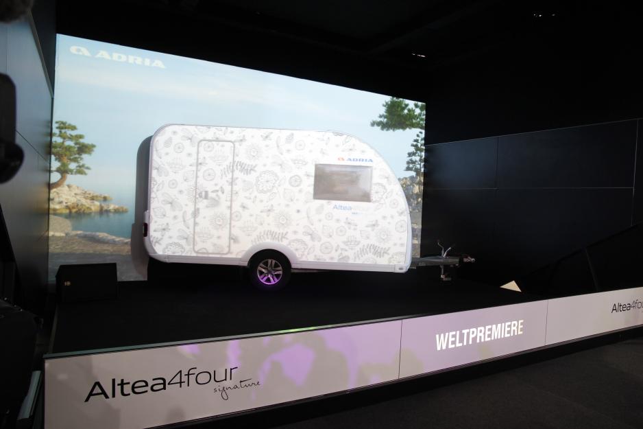 Det mest visuelt spennende på hele Caravan Salon i år tør jeg påstå var Adrias Altea som er en reisevogn som kan leveres med din egen utvendige dekor. Mulighetene ble effektiv demonstrert med en videoprojektor som brukte en hvit vogn til å vise et utall morsomme og kreative motiver. Vi kommer nærmere tilbake til denne unike campingvognen.
