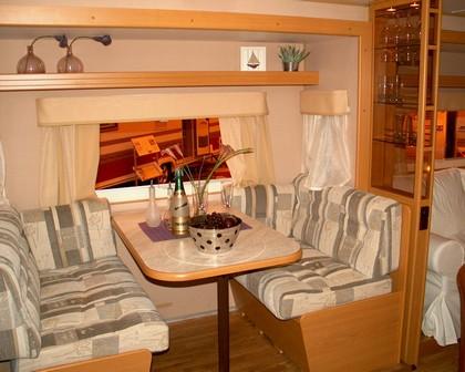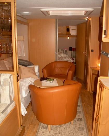 Når du går inn døren bakerst på høyre side har du garderobeskap og 2 køyesenger på din venstre side. På høyre hånd har du et stort kjøkken med kjøleskap, separat fryseboks og mikrobølgeovn. På motsatt side er det en rommelig sidesittegruppe med plass til 4 personer. I forlengelsen av kjøkken og spisekrok er det en stor stue med sofa, sofabord og to lenestoler. I enden er det fast dobbeltseng og badeværelse med toalett.