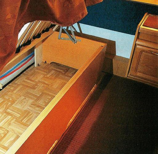 Badet sitter midt i vognen, på andre siden av kjøkkenet. Det er ustyrt med et Thetford fast toalett, en vask med underskap, et stort speil, vindu og to overskap. Det er ingen dusj i denne vognen, men det finnes i de større Fendt-modellene. Går vi over på andre siden av vognen igjen, mellom kjøkkenet og soverommet, finnes et høyskap. Soverommet er utstyrt med to enkle senger med lagerrom under. Begge enkle å heise opp og lett tilgjenglige. Mellom sengene er det plassert et felles nattbord, og over er det totalt ni overskap. Lagringsrommet under sengene kunne med fordel vært ustyrt med en bunn, slik at det fortsatt var sirkulasjon av luft når disse ble pakket fulle av dyner, tøy og annet. Med luftbåren varme er det jo en forutsetning at luften får sirkulere.