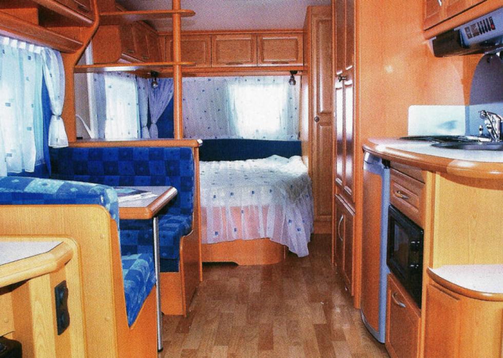 Det er hele 20 overskap i denne vognen, inkludert kjøkkenet. Ti er plassert over rundsittergruppen, og seks over dobbeltsengen. Overskapene måler i snitt 27cm. I høyden, 44cm. I bredden og 29/32cm. i dybden. Ved siden av kjøkkenet finner man to høye skap som kan brukes til lagring. Under dobbeltsengen er det også et laggerrom, men vi hadde problemer med å få åpnet dette rommet tilfredsstillende innenfra. Det er mulig det finnes et triks her som vi ikke skjønte noe av. Rommet har også tilgang utenfra.