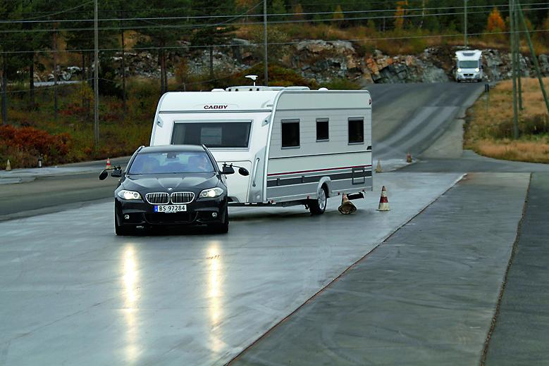 –Hvilke forventninger hadde du til glattkjøring med campingvogn? – Jeg var spent på å teste ut hvordan vognene ville oppføre seg på banen. Regnet med at de ville gå ”veggimellom”. Men det gikk bedre enn jeg trodde. – Den første øvelsen var å bli kjent med underlaget og gjøre en nedbremsing på rett vei, hvordan gikk det? – Kjøringen rett frem skapte ikke de store overraskelsene, ekvipasjen ”seilte” stort sett rett frem. Men ved litt rattutslag dro vogna ut. Mer spennende ble det ved unnamanøver: Det gikk greit i hastigheter opp mot 40-45 km/t. Campingvognen dro da ut, men lot seg lede gjennom kjeglene. I 50 km/t kom vogna bakfra for fullt og dro med seg et par kjegler. Nødoppbremsing og unnamanøver i en slik hastighet ville nok skapt problemer på isete vei, med stor risiko for ulykke. – Hva med å kjøre i glatt sving? – Svingkjøring gikk greit, jeg kjente at vogn og bil dro utover ved rundt 45-50 km/t. Jeg ville nok ikke kjørt så fort på glatt vei på vinteren. At øvelsen gikk så bra, skyldes stabilisatorkoplingen på vognen, og i enda større grad alle de elektroniske hjelpemidlene på en moderne bil, som ABS, DTC og antispinn. Jeg prøvde å øke farten, svinge ut og provosere litt forsiktig mens jeg var ute på "glatta", men det var ikke bilen villig til. Det hadde nok gått annerledes om jeg hadde koplet ut alle hjelpesystemer. Det skal sies at svingen var krapp og jeg hadde ikke ønsket å kjøre noe fortere i svingen selv på tørt sommerføre.