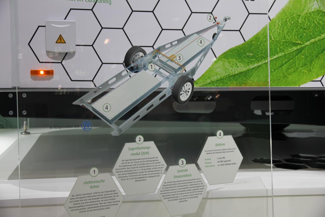 Den første er batterier med høy ytelse, og de to elektriske motorene med intelligent styrelektronikk. Det er disse som gjør at vi snakker om en aktiv campingvogn, det vil si med drift! Spesielt viktig er sensoren og styringsmodulen til e.home coco. Den styrer begge akselens 2 elektriske drivmotorer nøyaktig, slik at tilhengerbelastningen på trekkvognens koblingshode reduseres til en definert verdi - på for eksempel 100 kg. Dette gjør at den totale massen som kan trekkes er langt over den tillatte hengervekten på bilen. I kombinasjon med en elektrisk bil kan man oppnå praktiske kjøreavstander. Når du kjører nedoverbakke, blir batteriene ladet opp.