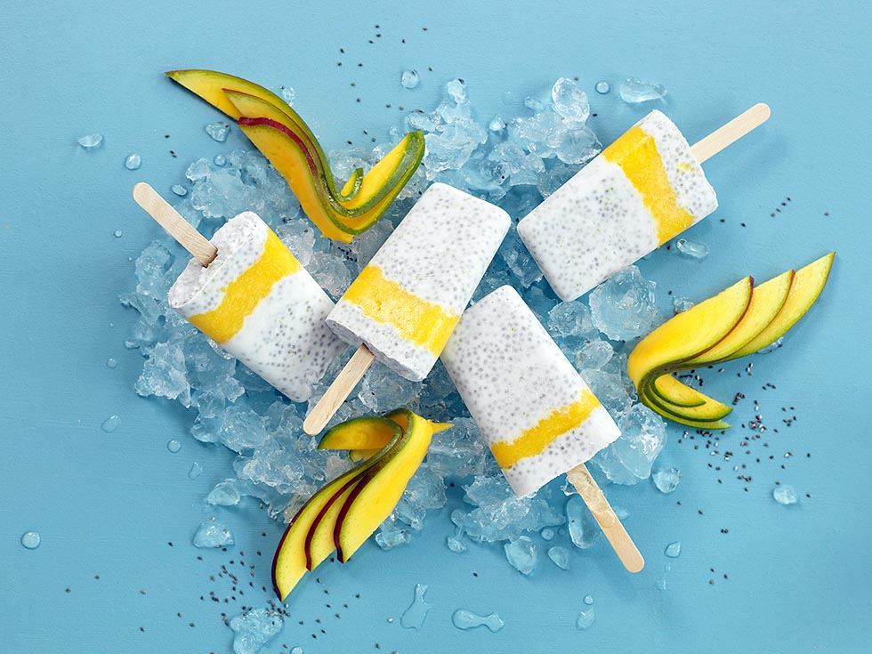 - Fordel mango i isformene og hell i resten av blandingen med chiafrø. Sett formene i fryseren. Stikk inn ispinner når blandingen såvidt har begynt å stivne. La formene stå i 3-4 timer, slik at isen stivner helt.