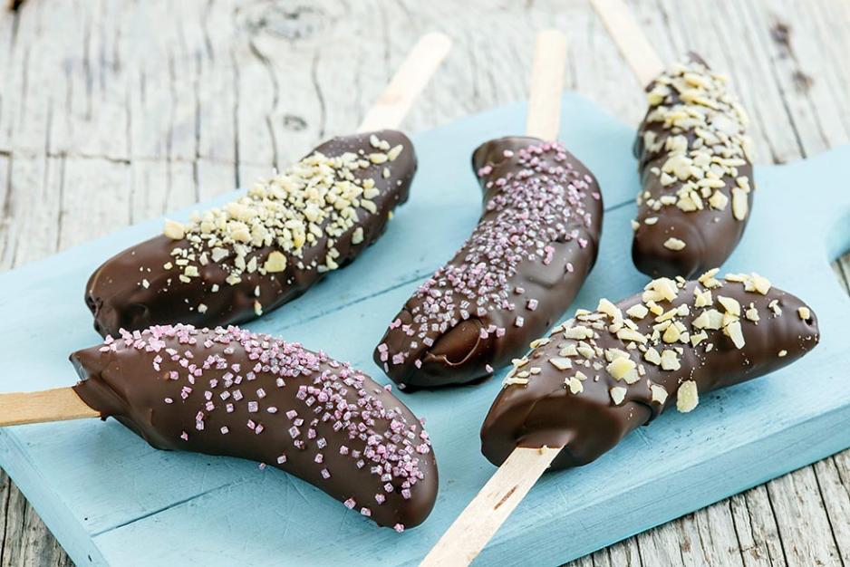 - Dypp bananer i sjokoladen og strø på hakkede mandler eller kakepynt.