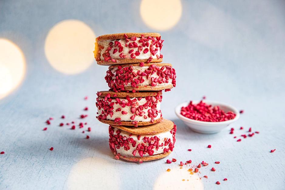 - Ta ut iskremsandwichene fra fryseren og rull i frysetørket bringebær.