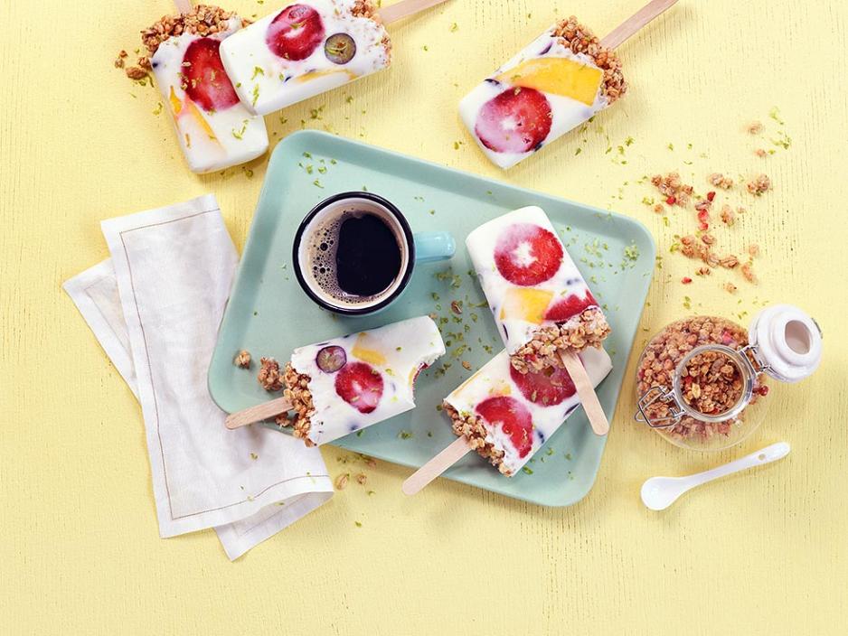 - Ha litt granola på toppen av hver isform før du setter i ispinner. Sett formene i fryseren i 3-4 timer.