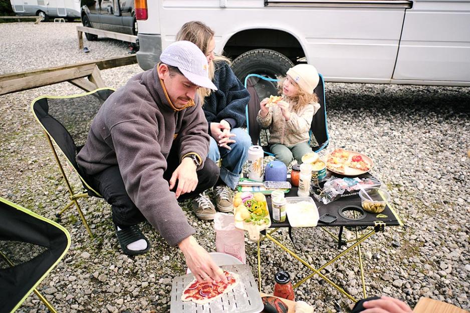 Pizza er virkelig den ultimate sosiale matretten, spesielt når du får lage din egen. Jeg hadde tilberedt en stor bolle med deig, og deretter satte vi frem fyll og et utvalg av toppinger. Det ble en skikkelig pizzafest. Det tar mindre enn to minutter å steke en pizza i den ovnen vi bruker, så dette går unna. Filippa (5) var yngstemann i reisefølget og var helt i ekstase. Hun danset rundt og laget pizza til de som ville ha. Selvsagt fikk hun fikk hjelp til selve stekingen, for når ovnen er over 400 grader sier det seg selv at det er en oppgave for voksne.