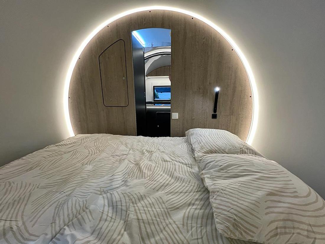 Vi har skrevet om deres campingvogn tidligere, men jeg har aldri vært inne i en. Som du kan se på bildene er det snakk om en to meter bred campingvogn. Produsenten har ulike modeller, både med to eller tre deler. Når du har parkert den fire kvadratmeter store vogna, kan du kjøre ut modulene sideveis og få opp til 12 kvm boareal. Den store boflaten i kombinasjon med formen på vogna gjør det til en unik følelse å komme inn i vogna. Vi fikk aldri demonstrert hvor omfattende jobb det er å få på plass utvidelsen, men videoer på nettet viser at det skjer elektrisk og at det er flere smarte detaljer som faller på plass når den tripler sin størrelse.