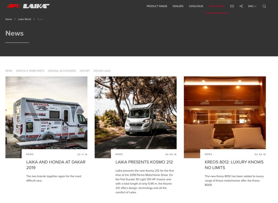 Den nye laika.it (ekstern link, åpnes i separat vindu) nettsiden er nå tilgjengelig på åtte språk (italiensk, engelsk, tysk, fransk, spansk, svensk, norsk og nederlandsk) for å gi tilgang til innhold til alle fans og entusiaster i Europa og i verden. Galleriet på hjemmesiden presenterer et utvalg av de siste nyheter.