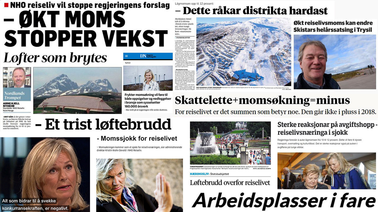 Stortinget vedtok i 2017 å øke den lave merverdiavgiften fra 10 til 12 prosent, med virkning fra 1. januar 2018. Dette har rammet lønnsomheten og arbeidsplasser ved hotell, camping, fornøyelsesparker, skiheiser, idrettsarrangement, museer, kino og persontransport. Merverdiavgiften økte fra 8 til 10 prosent i 2016. Til sammen utgjorde dette en momsøkning på 50 prosent på to år. NHO Reiseliv advarte sterkt imot økningen.