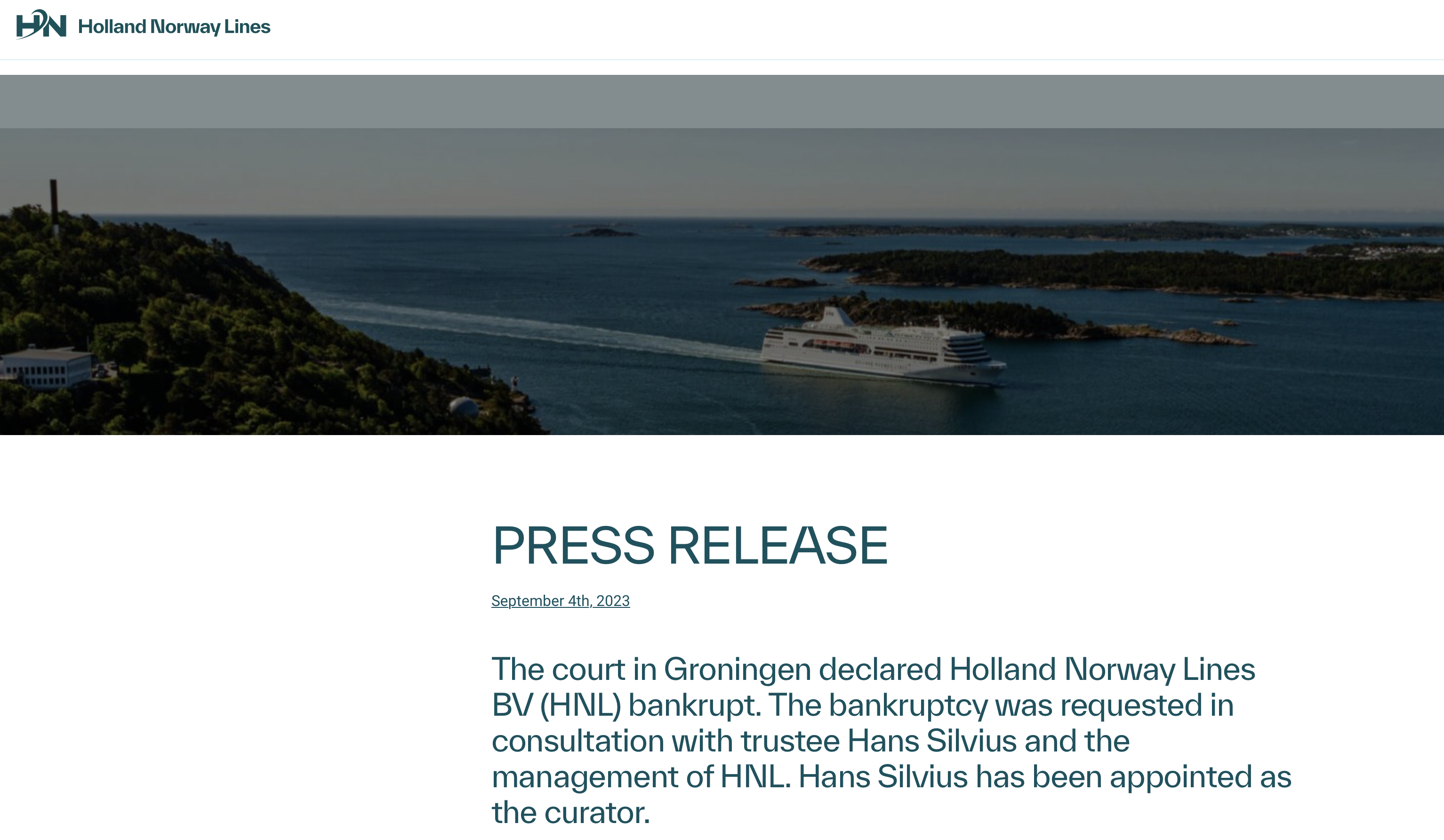 Både moderselskapet og det norske datterselskapet til rederiet Holland Norway Lines, som seilte mellom Kristiansand og Cuxhaven/Emden, har gått konkurs melder E24.no i dag.