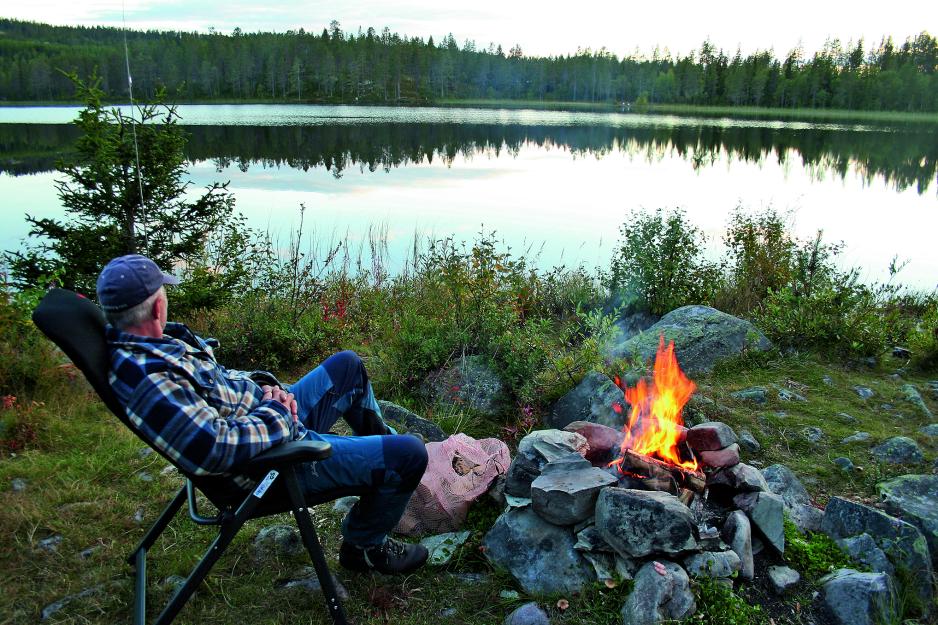 Dette er livet, og nå skal det fiskes, fyres bål, vi skal la oss imponere over hvor vakkert og stille det er her oppe, over høstsol, krystallklar luft, fullmåne og lav tåke over vannet. Mens gradene synker ute, og temperaturen i bobilen er stabile 22 grader.