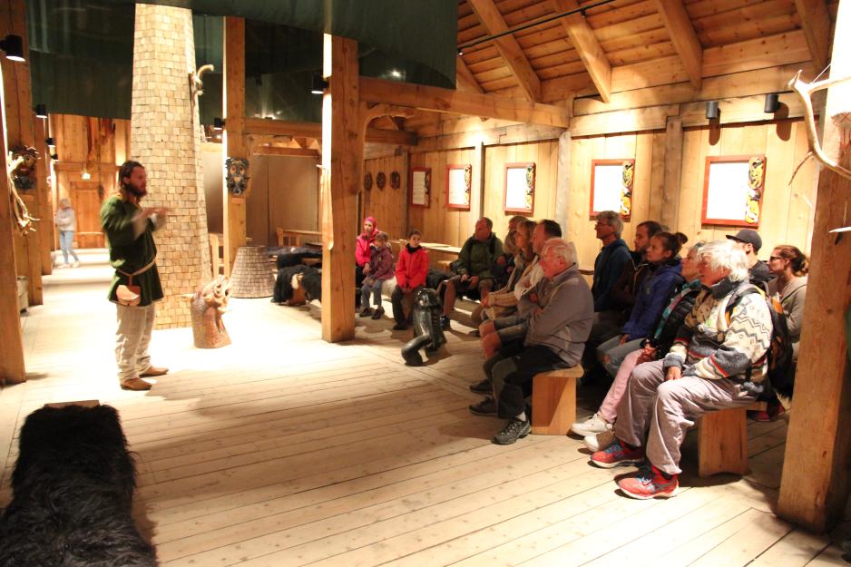 I museet kommer du først inn i bygget med utstilling og butikk. Har du dagen foran deg; begynn gjerne med utstillingen. Neste post er langhuset. Her er det bygget opp et realistisk miljø med sove-, spise- og arbeidsplasser. Test gjerne ut fotohøydepunktet: Høysetet med en vikinghjelm og sverd!