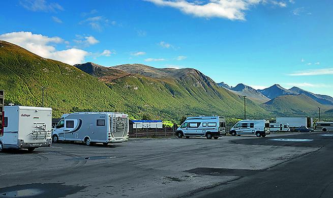 – Nå kommer vi fra bobilparkeringen ved jernbanestasjonen i Åndalsnes og er på vei til Geiranger. Det var 10 bobiler der, med god plass. Det var greit å stå på parkeringen, som var asfaltert, men uten fasiliteter, sier David.
