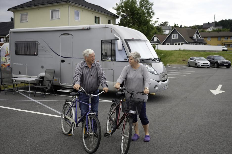 – Vi trives best med å stå ved sjøen, liker å stå ved båthavner, så Florø har alt vi ønsker! At det er så få bobiler her er vel fordi Florø ligger utenfor ruten som mange følger langs E39. Det er fantastisk natur, vi trives her og legger inn en ekstra dag. Vi har med våre gode og gamle sykler. De er såpass slitt at vi ikke trenger å låse dem - det er ingen som vil ha dem. Det er godt å trimme litt, og el-sykkel blir det ikke ennå. Når vi har med syklene er vi mer aktive. Vi rekker over et større område når vi sykler enn når vi går. Bobilfolket er blide og hyggelige med hverandre og vi stortrives med bobilen, men har ikke helt glemt teltturene, så noen overnattinger i telt blir det ennå, sier Solveig og Gustav fornøyd.