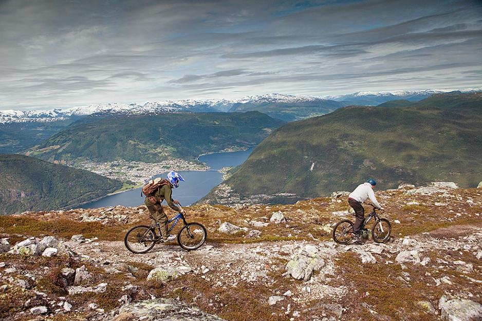 Første sted vi skulle lete var på Storehaugen, 1132 meter over havet. Ved ankomst til den lille flystripa som representerte Sogndal flyplass, lastet vi som hadde sykler dem av den praktisk anlagte bakenden og skilte lag. Derfra trasket vi til fots oppover mellom trolske furutrær, lyng og snøfonner preget av en treg sommer. Sola snek seg mellom skylaget og optimismen steg enda et hakk når vi nesten 1200 meter over havet snudde oss og så utover fjellheimen i fedrelandet. Dette er Norge tenkte jeg stolt, mitt hjemland. 800 høydemeter med opplevelsesrik terrengsykling senere befant vi oss nede i Sogndal sentrum, hvor bobilen stod klar for å frakte oss enda et hakk nærmere polarsirkelen.