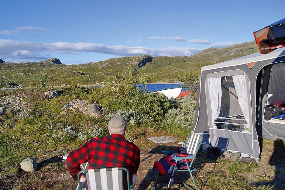 Jeg skal derimot innrømme at vi enkelte ganger drømte oss bort til fjorårets fjelltur, som vi tilbragte i bobil. Og apropos bobil, etter et par overnattinger dukket det opp nettopp en bobil på vårt ellers så stille, fredelige og "hemmelige" sted. Ut kom en trivelig gjeng på fire. Det viste seg dessuten at denne gjengen, ved hjelp av en tidligere artikkel i Bobil & Caravan, samt bruk av moderne teknologi, hadde klart å finne VÅRT sted.