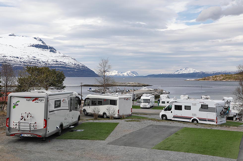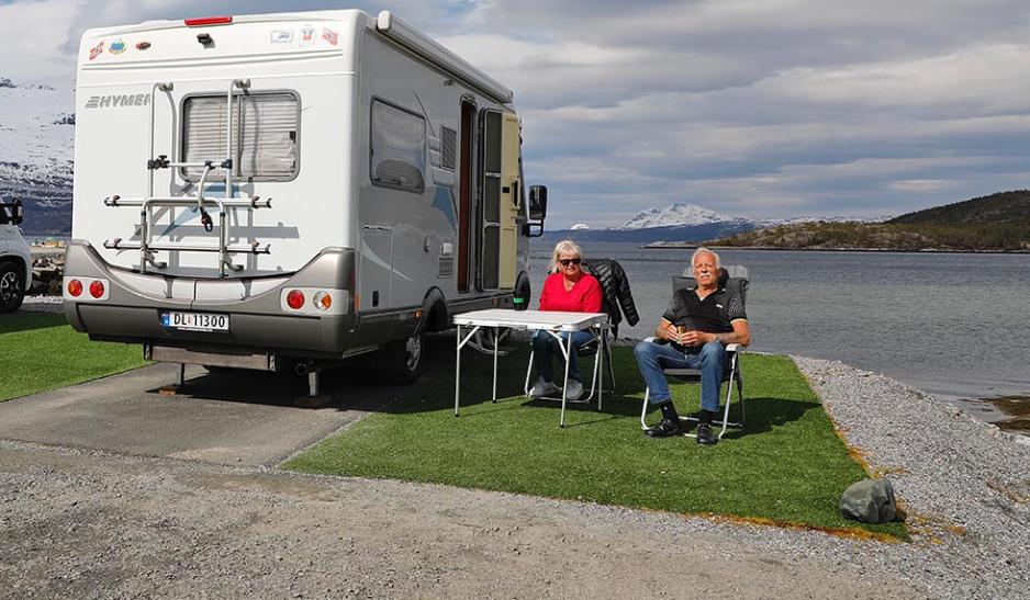 – Dette er en skikkelig fin plass å være. Vi setter først og fremst pris på utsikten, og har nærmest «fast plass» nede ved sjøen her på Innhavet Bobilplass, forteller Torill og Bjørnar Hjemaas.