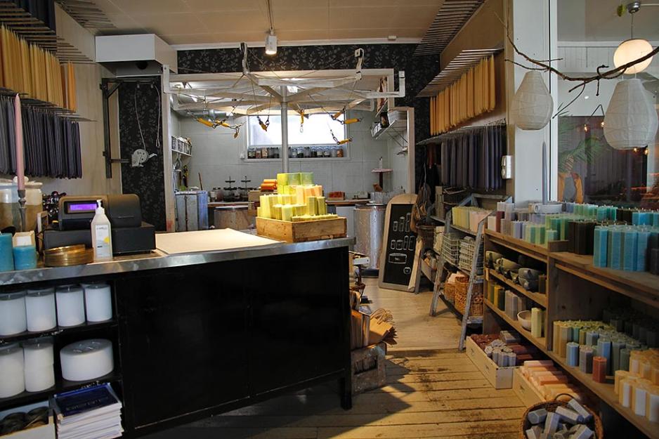 Vi var litt uheldige med været, og hadde mye vind. Det gjorde at vi tok oss god tid på Kafé Lysstøperiet, som ligger midt i byen. Her var det koselig, avslappet atmosfære og en fin mulighet for oss til å lade batteriene etter mange dager på tur. På menyen var det både god kaffe, pizza og bakervarer. Det var også et lysstøperi, hvor en kunne kjøpe diverse lys som hadde blitt støpt i lokalet. Selv om det var trivelig å sitte her inne og se de forbipasserende blåse avgårde, måtte vi til slutt bevege oss ut i blåsten. Vi hadde nemlig flere mål for besøket.