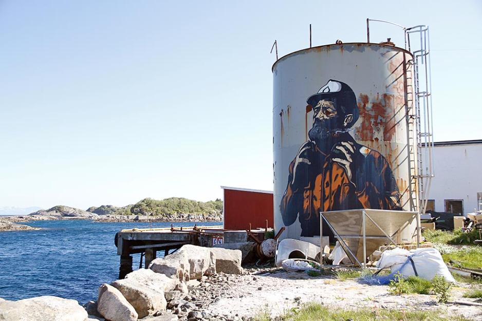 En gammel oljetank ved Henningsvær kai har blitt brukt som lerret for verket “Fiskeren”. Motivet er en piperøykende fisker ikledd oljehyre og en gammel Statoil-caps. Verket har av mange blitt sett som en kritikk av oljeindustrien, ved at det setter den klassiske fiskeren i en slik sammenheng.