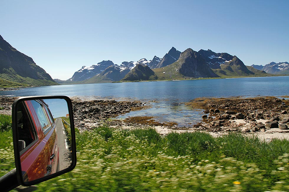 Parkeringen vi valgte oss ligger rett ved veien, men det er lite trafikk her om natten. Det ga oss ro og en overraskende sterk følelse av å være tett på naturen. Vi var alene på plassen denne natten midt i juni, men i høysesong kan jeg se for meg at det er flere som tar området i bruk. Lommene var store og romslige, og kan nok lett romme to biler hver. Vi utnyttet at vi var alene og kunne breie oss ut, og rygget på plass med åpen bakluke ut mot havet. Det er ikke mulig å klage på den utsikten som møtte oss neste morgen: Blått, stille hav, sol og snødekte fjelltopper.