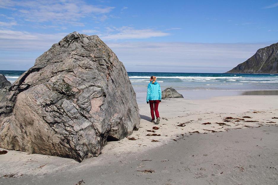 Neste morgen fulgte vi veien videre, og etter kun få minutter kom vi til den lille bygda Vikten. Her kan man finne et glassblåseri, en kafé og en ekte Lofot-strand som strekker seg langs bygda mellom fjelltoppene. Hovedattraksjonen, Glasshytta Vikten, er lett å få øye på. Den moderne bygningen ligger midt i “sentrum”, og her er det mulig å se glassblåsere i aksjon og kjøpe – eller bare beundre – resultatene som er på utstilling rundt om i det flotte lokalet.