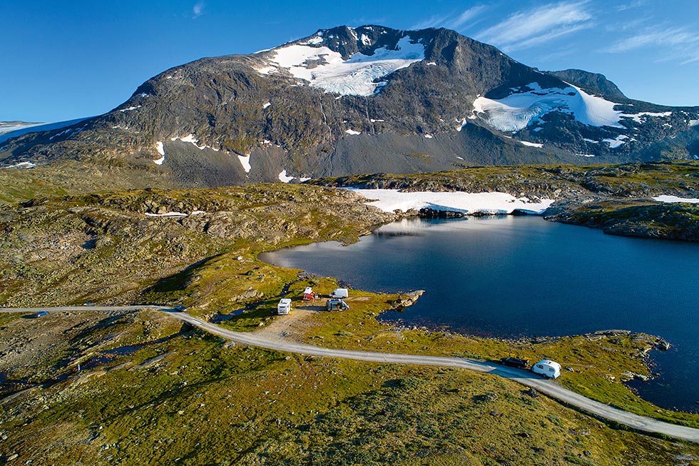 Jotunheimen er et fantastisk område for en vårtur med bobil! Det er særlig Fv51 over Valdresflya og Fv55 over Sognefjellet som gir fantastiske fjellopplevelser. Her er sju flotte overnattingssteder langs disse veiene.