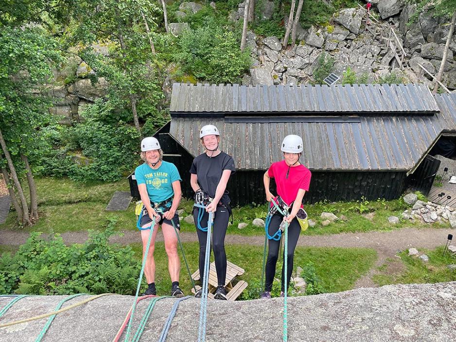 Og ingen i gruppa vår hadde tidligere rappellert, så her er det en jobb å gjøre tenkte vi. Men med hjelm på hodet, klatresele rundt liver, rykkdemper og doble tau lente vi oss forsiktig bakover og utover testfjellveggen. Det å oppleve at alt holder, og at man selv har kontroll på hastigheten nedover, er en fantastisk følelse. Instruktørene var meget gode og ga oss alle troen på at dette var mulig å få til. For en start! Vi var klare for klatring.